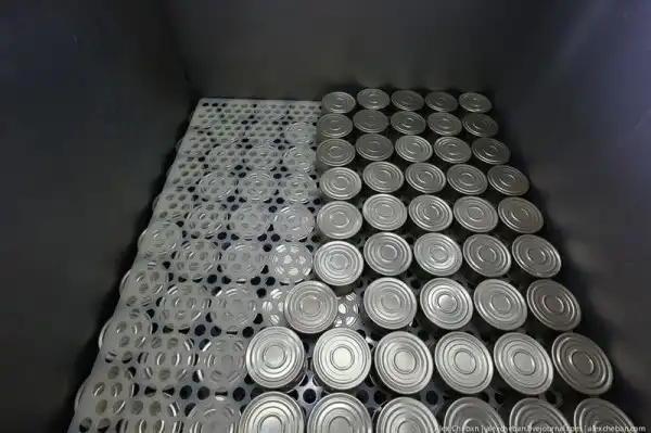Затем в банки загружаются в транспортеры и помещаются в итальянский автокалав прямо в закатанных (!) банках и нагреваются до 120 градусов за 20 минут. Экспозиции температуры 120 градусов составялет 55 минут. Затем остывают в течении 20 минут. Т.е. формула тушения и стерилизации - это "20-55-20":