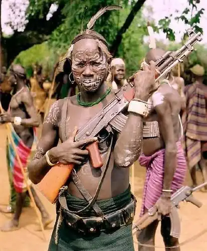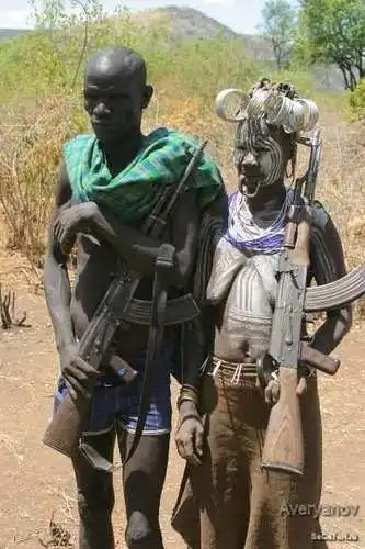 В Эфиопии живет одно из самых необычных племен мира - Мурси. Они считаются самой агрессивной этнической группой. Все мужчины ходят с автоматами калашникова, которые им нелегально передают через границу. К тому же они начинают выпивать с самого утра, и, ближе к обеду, становятся неконтролируемыми.