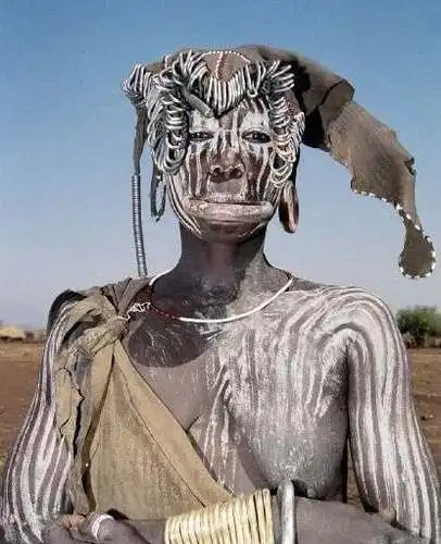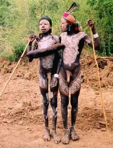 Экзотично выглядят их вздутые животы, на кожу которых нанесена своеобразная ритуальная татуировка, в виде симметричных линий, состоящих из отдельных рубцов - желваков. Эти "бугорки" имеют как различные размеры, так и разнообразные формы: круглые, овальные, линейные. "Наносят" их на себя довольно своеобразным и жутким способом. Через насечки в коже, под неё заталкиваются личинки разнообразных наземных и водных африканских насекомых-паразитов.