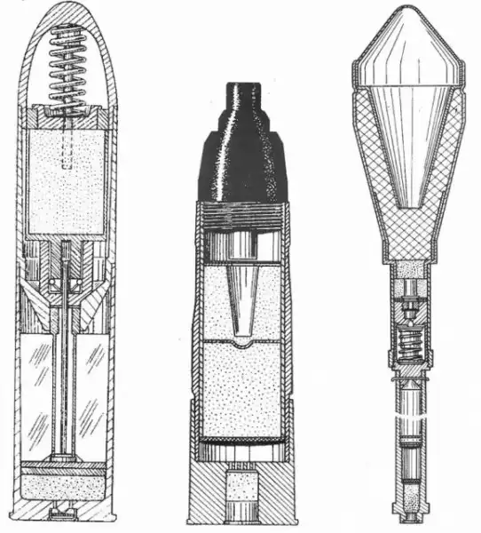 Пистолетная граната с оперением Wurfkorper 326 LP (слева) и пистолетная граната с готовыми нарезами Sprengpatrone. Пистолетная противотанковая кумулятивная граната Panzerwurfkorper 42 LP (справа)
