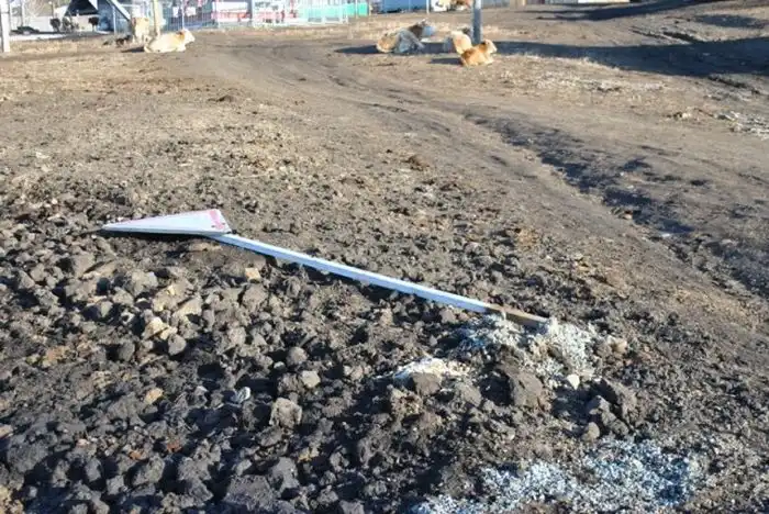 Наспех скрученные стальные поперечные детали, удерживаемые еле прикопанными столбиками,