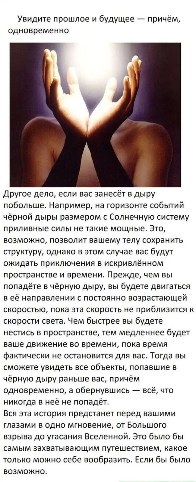 К сожалению, современной науке пока не известно, что произойдет, если вы сможете попасть в черную дыру. Но что же нас может ожидать по ту сторону входа в самые плотные и тяжелые космические объекты?