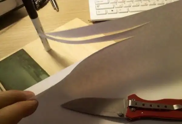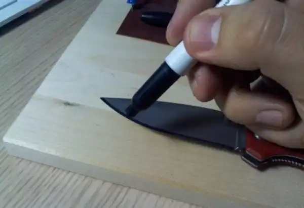 Берем нож и маркером проводим по режущей кромке. Для наглядности и равномерности процесса заточки.