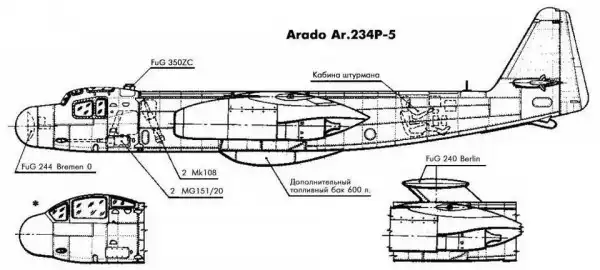 Модификация Ar-234P-5 самолета Ar-234C с обтекателем Telefunken, содержащим радар FuG 240 N4 Berlin