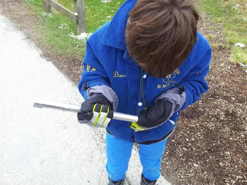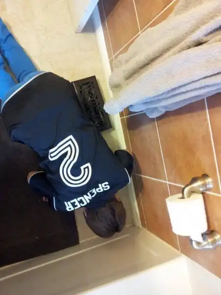 Сказал сыну, что уронил в решетку доллар. Доллар лежал рядом с трубкой так, что не заметить её было невозможно.