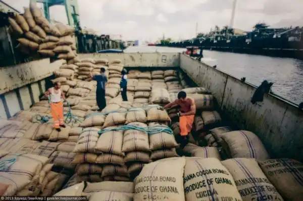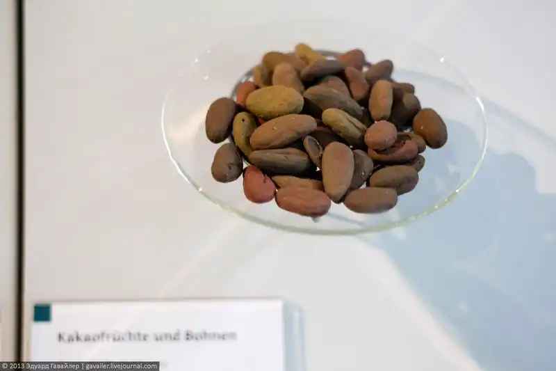 Плоды какао, похожие на вытянутые лимоны грубой формы, созревают за 4–7 месяцев, после чего срезаются рабочими (раньше по большей части рабами). Один такой плод весит от 300 гр. до 1 кг.