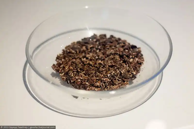 В специальных установках отделяется шелуха, после чего их дробят до образования тертого какао (или какао-массой, которая возникает при нагревании)