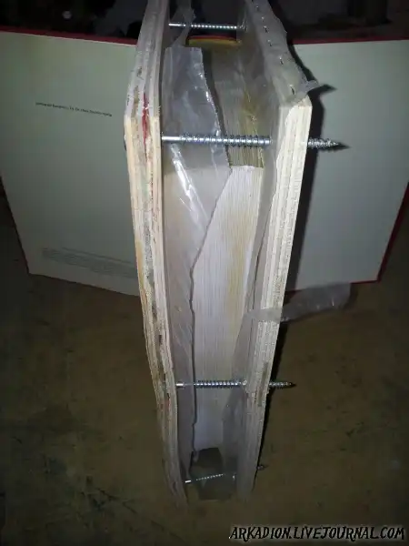 Шаг1. Вырезаем из фанеры 2 платки по размеру больше страницы у книги на 3-4 сантиметра по трём сторонам. Кладем на одну из плат плёнку или пакет, затем кладем книгу на пленку последней страницей согнув титульные страницы ( можно как я оставить первых несколько страниц), опять накрываем пакетом и сверху кладем вторую фанерку.Смотрим чтоб страницы легли ровно и небыли замяты и скручиваем этот "сэндвич" шурупами. Пакеты нужны чтоб в последствии всю эту конструкцию можно было легко разобрать . Далее берем губку и клей , и наносим тонкий слой на торцы листов. Сильно много не нужно наносить во избежании потеков. Оставляем сохнуть. У меня полный процесс сушки занял около 2 часов.