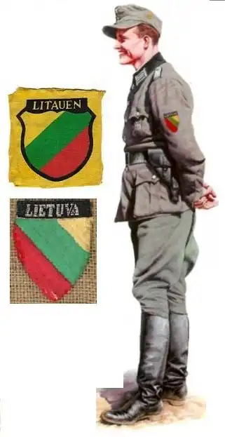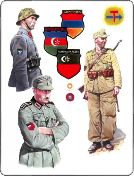 Первыми национальными группами советских добровольцев, которые вошли в вермахт в виде организованных подразделений, были легионы, набранные из представителей народов Кавказа и Средней Азии. На фотографии - старший сержант и младший лейтенант из Грузинского легиона, они носят красные петлицы с белым кантом, специально предназначенные для Восточных легионов. На младшем лейтенанте видна грузинская нашивка красного цвета с черной и белой полосками и погоны. На сержанте мы видим ленту Знака отличия для восточных народов 2-го класса. По аналогии с Железным крестом она продета в петлицу мундира. Более дюжины батальонов Грузинского легиона были посланы на фронт. Один из них - 823-й - закончил свою службу в составе гарнизона острова Гернси.