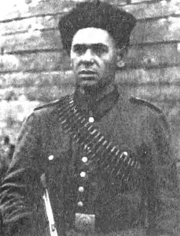 Казаки - погоны такие же, как у русских и украинцев. Красные петлицы с белыми перекрещенными пиками; на петлицах всех рядовых и сержантов темно-зеленая кайма, а у всех офицерских чинов - белая.