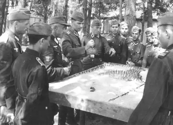 Генерал-инспектор восточных войск генерал Хельмих присутствует на учениях подразделения Туркестанского легиона. Азиатские добровольцы носили тропическую униформу германской армии со стандартными сине-серыми на желтовато-коричневом фоне петлицами и нагрудными знаками отличия. На головных уборах они также носили германские знаки различия.