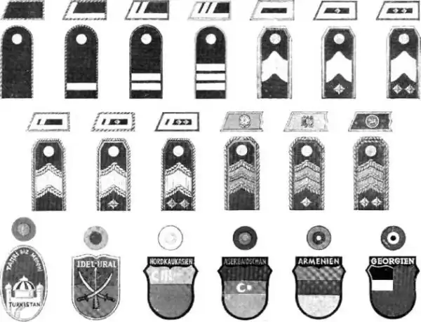 Образцы нашивок некоторых Восточных легионов. "Северный Кавказ": верхняя часть - зеленая, нижняя -красная, рисунок - белый; "Азербайджан": цвета (сверху вниз) - синий, красный, зеленый, рисунок - белый; "Армения": цвета (сверху вниз) - красный, темно-синий, оранжевый, надпись - оранжевая; "Грузия": красная с черно-белым крыжем; "Туркестан": голубовато-зеленая с белой мечетью, темно-синими деталями на центральном куполе, остальные купола и полумесяцы - желтые, надпись внизу - темно-синяя, вверху - желтая; Волжско-татарский легион: верхняя половина - темно-синяя, нижняя - зеленая, кайма и буквы - желтые, центральный рисунок - белый.