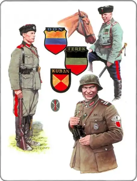 На этой церемонии торжественного богослужения донских казаков мы видим на них забавную смесь германской униформы и форменной одежды царской армии. Синие фуражки с красным околышем и тесьмой и синие галифе с красными лампасами напоминают традиционный костюм донских казаков. Мундиры на казаках - немецкие, с несколькими вариантами казачьих петлиц.