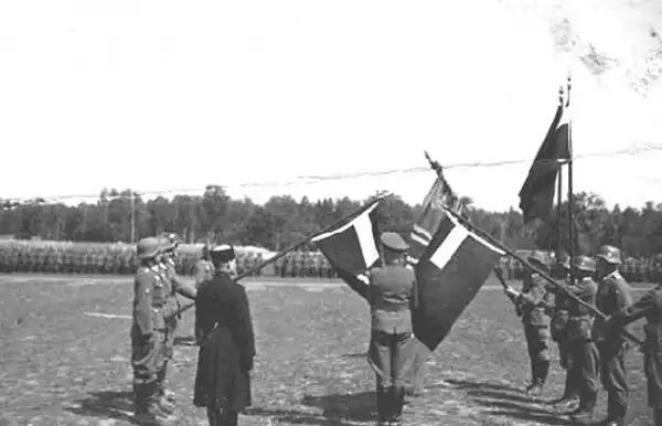 Украинская группа добровольцев присягает на верность перед немецким и национальным желто-голубым с черным "трезубцем Св. Владимира" флагами.