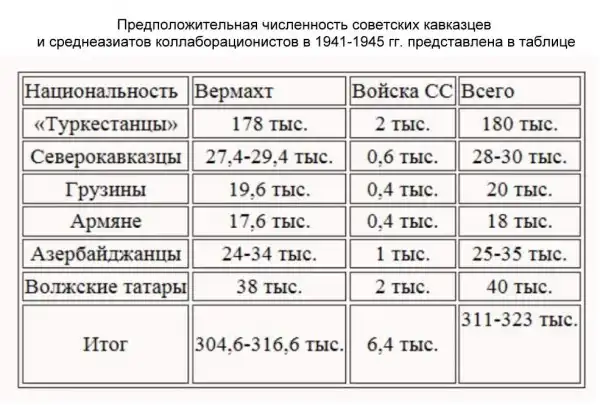 В целом, немецкая политика опоры на советских кавказцев и уроженцев Средней Азии и противопоставление их русским провалилась. Как бы не изворачивались идейные наследники и современные апологеты действия советских коллаборационистов в годы Великой Отечественной войны являются не "борьбой за освобождение от сталинского режима", а простым предательством.