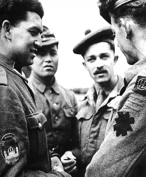 "Туркестанские" легионеры и взявшие их в плен шотланцы из 51-й дивизии английской армии. У легионера чётко видна эмблема с надписью "TURKISTAN" (была и другая разновидность - с луком и стрелой)