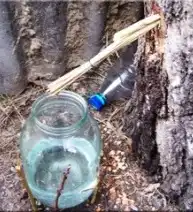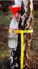 — Приступая к сбору, можно сделать на дереве неглубокий надрез, но лучше всего просверлить буравчиком отверстие на глубину несколько сантиметров и вставить в него желобок или трубочку, по которой сок будет стекать в подготовленную посуду.