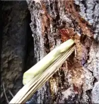 2. В березе делается отверстие, ближе к корню, если есть чем, на 4-5 сантиметров в глубину. Туда вставляем пучек соломинок и сверху прижимаем маленьким чепиком, выстроганным из дерева. Все это дело занимают 5 минут.
