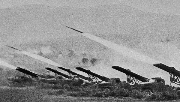 В лощине, на огневых позициях батареи, раздался ни с чем не сравнимый оглушительный рев и скрежет. Казалось, произошло что-то совершенно необычайное. Поднимались огромные черные клубы дыма и пыли. Вверх взметнулось около сотни ракет, оставлявших за собой ясно видимые беловатые курчавые струи быстро растворявшихся в воздухе газов.