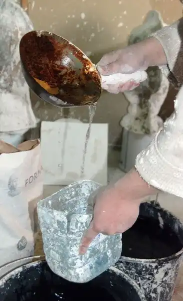 Насыпаем совком гипс до образования небольшой горочки над поверхность воды.
