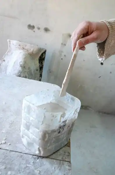 Создание гипсовой головы начинается с гипсового раствора. Рецепт гениально прост: гипс и вода. Заливаем воду в емкость (в нашем случае пластиковая бутыль, точнее, ее нижняя часть).