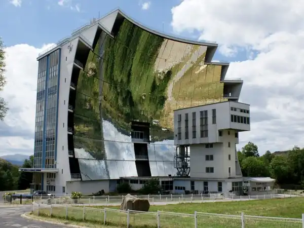 8. Солнечная печь. Оделио, Франция. Это уникальное сооружение создано для улавливания лучей Солнца и создания высоких температур. Покрытое сплошь изогнутыми зеркалами, оно порой сияет так, что невозможно на него смотреть. Выстроенная еще в 1970 году в Восточных Пиренеях, Солнечная Печь до сих пор остается крупнейшей в мире! Весь массив зеркал выполняет функцию параболического отражателя, и температура в фокусе может достигать 3500 градусов по Цельсию. Регулировать температуру можно, если устанавливать зеркала под разными углами. Солнечная Печь является экологическим, эффективным и недорогим способом получения высоких температур.