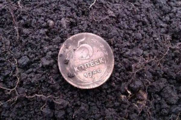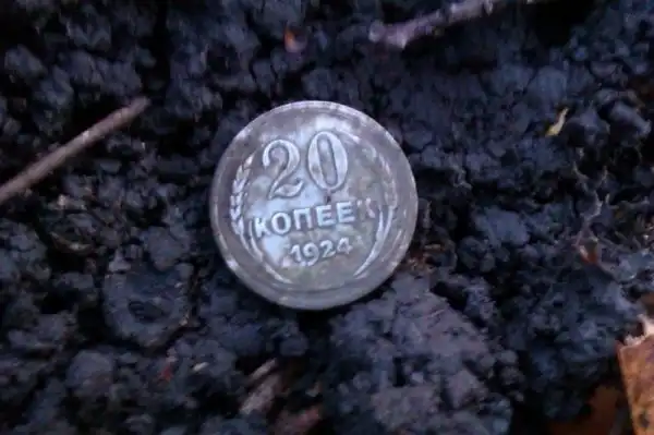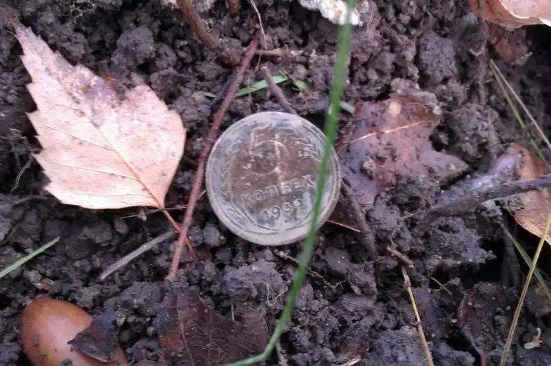 Темнело. Я немного расстроился и начал уставать. Посидев, решил двигаться обратно, в сторону входа и, попутно, искать. Где-то на середине моего обратного пути, раздался четкий сигнал под одним из деревьев. Сигнал был прямо под корнями и, чтобы их не повредить, пришлось копать прямо под них. В уже надвигающейся темноте, что-то блеснуло и вот: