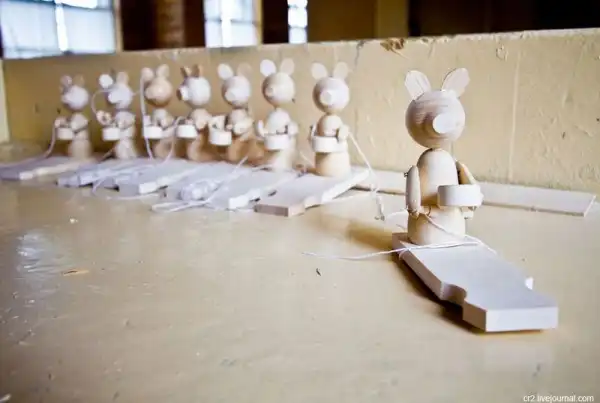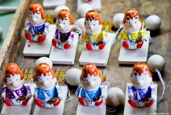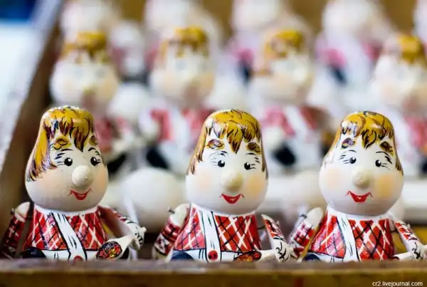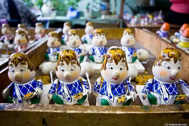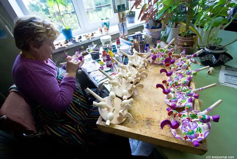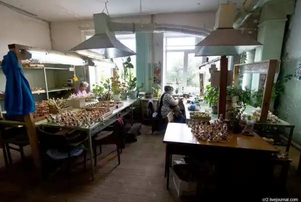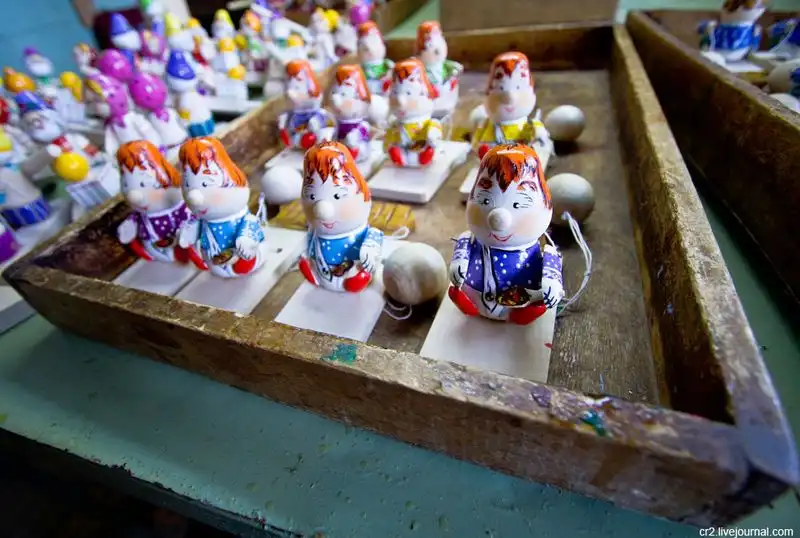 Работают гуашью, а после покрывают безвредным масляным лаком. Раньше на фабрике дела шли отлично и работало несколько сотен человек. Теперь рабочих становится всё меньше и меньше, некоторые цеха даже пустуют. Говорят, что за 12 лет коллектив уменьшился в 2 раза и сильно постарел.