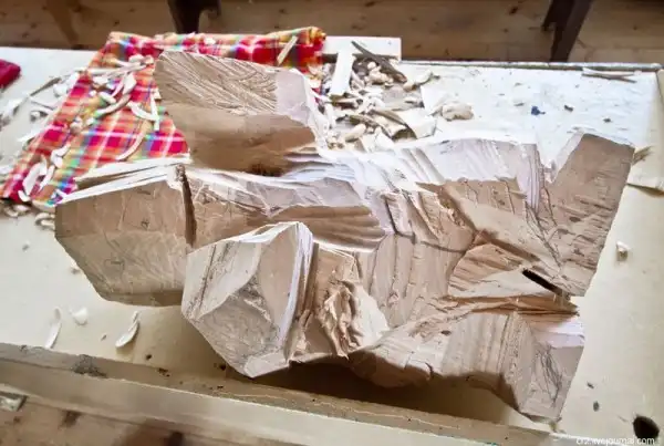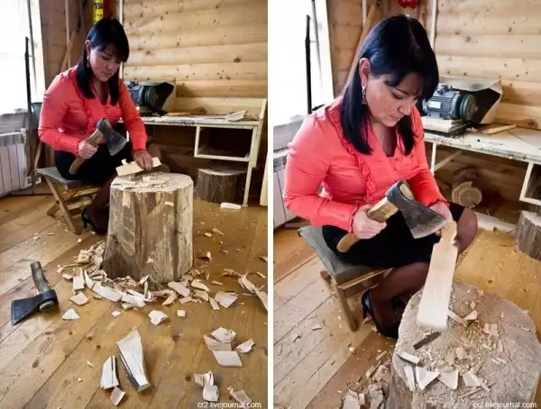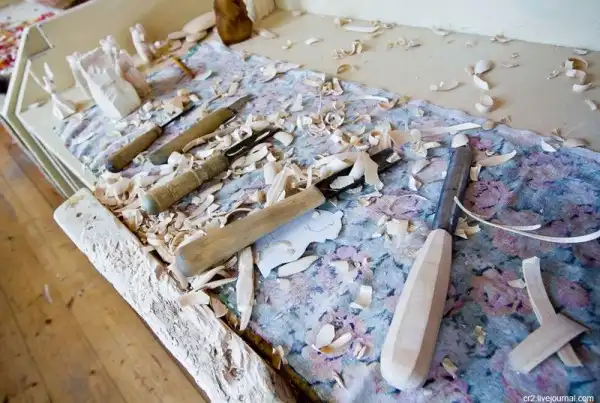Потом обрабатывают инструментами — стамесками и специальными очень острыми богородскими ножами. Да, ножи тоже были местные. Когда-то пока одна часть села делала игрушки, вторая — готовила ножи и стамески для их изготовления. Сейчас мастера пользуются привозным инструментом или делают его сами, осталось только название