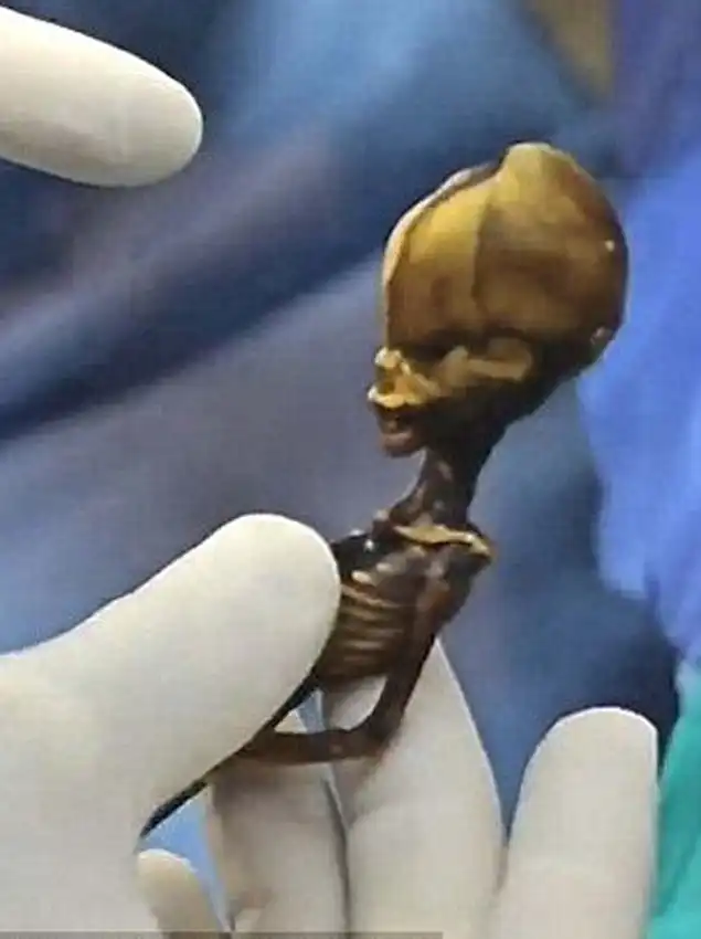 Трупик, как выяснилось, нашел некто Оскар Муньос (Oscar Munoz), чилиец. Нашел 19 октября 2003 года в пустыне Атакама (Atacama Desert) рядом с останками заброшенного храма у поселка Ла Нория (La Noria). Тельце коричневого цвета было завернуто в белую тряпочку. Голова - несоразмерно большая. Во рту - сформировавшиеся зубы. Ребер - 9 пар, а не 12, как у людей. На вытянутом черепе - нечто, похожее на гребень. Одно слово - инопланетянин. На что, собственно, и намекал Грир, подогревая интерес к фильму перед премьерой.