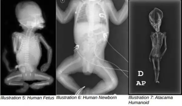 Рентген и томографию гуманоиду делали в 2012 году в Испании. Скелет Аты - крайний правый. Рядом с ним скелет новорожденного. Крайний левый - скелет человеческого зародыша. Они сильно отличаются.
