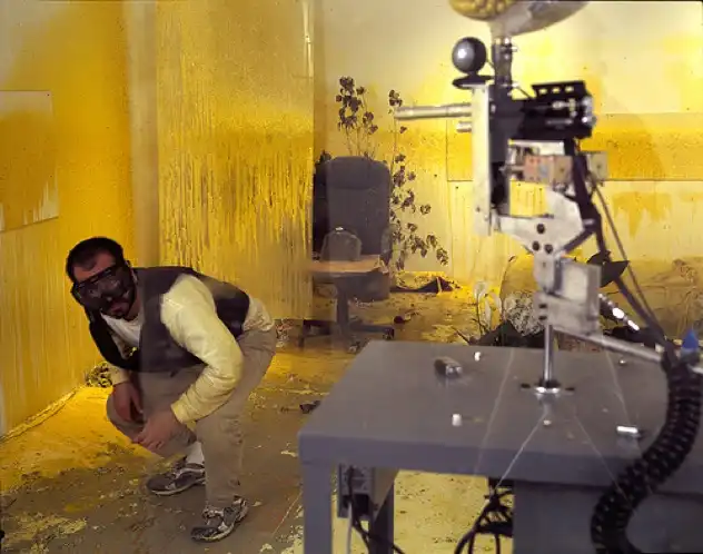 Одно это уже могло послужить основанием для шуток, но Билал пошёл ещё дальше: в комнате было ружьё для пейнтбола, к которому предоставлялся доступ, и он запустил его через Интернет.