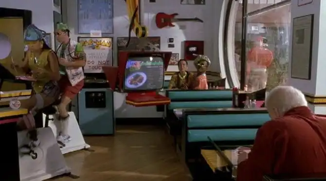 В кафе происходит знаковая встреча главного героя со стариком Биффом. Но нам больше интересно оборудование кафе, сделанного, кстати, в стиле 1980-х (даже игральный автомат той эпохи есть!). Обслуживают клиентов в нем допотопные ламповые телевизоры-роботы в образе Майкла Джексона.