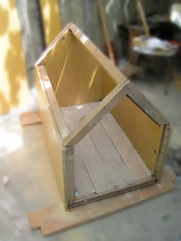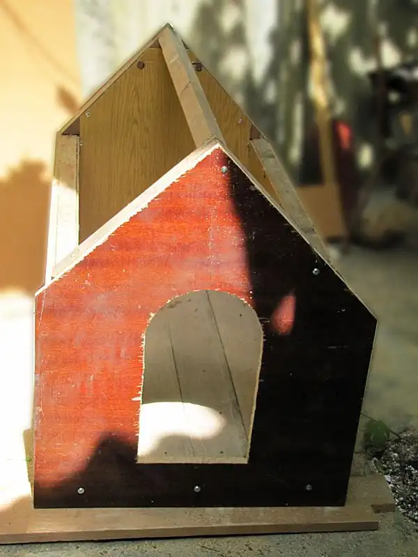 раздобыв заднюю стенку от обычного советского шкафа в гараже крепим её ко внутренней части будки предварительно раскроив.