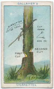 «Для начала, следует определить направление, в котором дерево будет падать. Затем необходимо надрубить ствол в двух местах – одно выше, другое ниже, как показано на картинке. После чего, при помощи верёвки, потянуть дерево в нужном направлении».