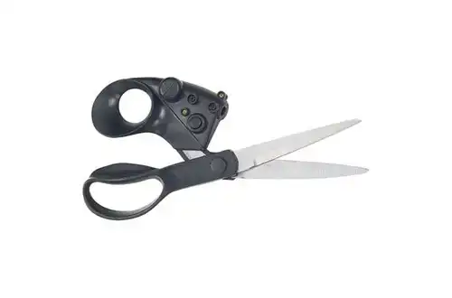 Обычные ножницы с длиной лезвия 9 см, но в ручку встроен лазерный прицел. Вес — 102 грамма. Питание — от двух плоских батареек LR44. Лазер включается кнопкой, далее луч длиной 21 см с помощью двух верньеров совмещается с лезвием, после чего следует аккуратно резать по лазерной «дорожке». Плюс гаджета — высокая точность в случае, когда линию разреза нельзя нанести на материал (изначально лазерные ножницы предназначались парикмахерам). Минус — небольшие размеры разреза.