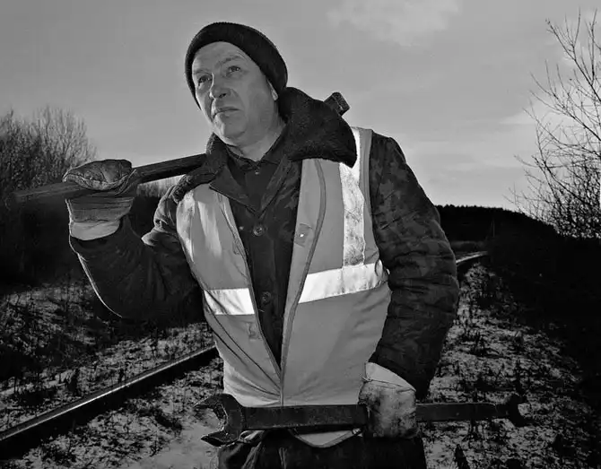 «Устал, конечно. Двенадцать лет ручными стрелками занимаюсь. Гаечный ключ килограммов пять весит, молоток — еще десять. Посторонние предметы из пазов убирать надо. Зимой снег вычищать надо. Сам рычаг опускать не очень тяжело — там противовес есть. Но от стрелки к стрелке приходится на своих двоих. Расстояние между стрелками под три километра. Раньше у нас дрезины были, а теперь так, ногами бегаем. В чистом виде стрелочников уже, считай, не осталось — монтеры путей многое делают: и стрелки переводят, и рельсы меняют, и шпалы укладывают. Вот мы вчетвером кусок рельсы кантуем — а он, между прочим, семьсот килограммов весит. Сейчас многое автоматикой заменено — оно, конечно, легче: с пульта стрелки переводить приятнее. Но все равно текучесть кадров у нас большая. Работа тяжелая, опасная, никто сюда не рвется. Раньше в бригадах по восемь человек работало, а теперь всего трое. Сокращают нас потихоньку. Пока еще работаем: стоим на шпалах, головой, как филины, в разные стороны крутим непрестанно. Бывает, сбивает монтера насмерть. Мне вот через семь лет на пенсию выходить, так я с удовольствием пойду. Хорошо, если к тому времени автоматику поставят: все наши отдохнут».