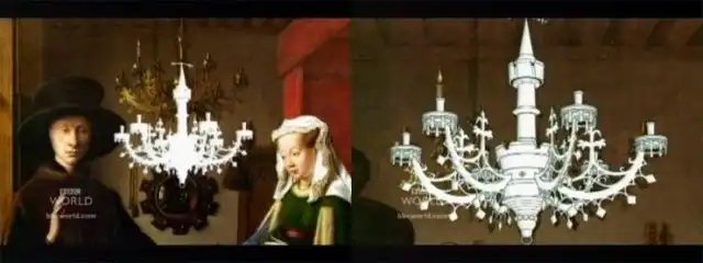 Совсем неудивительно, что размер спроецированной люстры сегодня точно совпадает с размерами люстры на картине «Портрет четы Арнольфини» — восемь дюймов в ширине. Ну и, конечно, блики на металле — теперь, на проекции, они стоят на месте и не меняются, когда художник меняет положение.