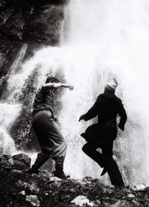 Каскадер Николай Ващилин дублирует Василия Ливанова в драке с профессором Мориарти (Виктор Евграфов) у «Рейхенбахского» водопада. Пицунда, Гегский водопад по дороге на Рицу. 1979 год.
