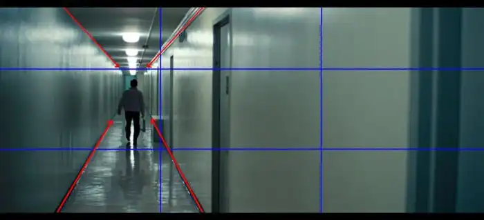 Именно следование “правилу третей” удалось придать этому кадру ощущение баланса. Кроме того, эффект усиливают и стремящиеся в одну точку линии длинного коридора (помечены красными стрелками), которые тоже направляют внимание зрителя на персонажа.