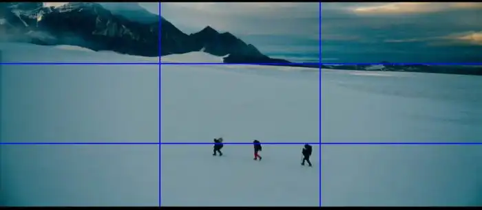 Фигура Бена Стиллера смещена вправо, за ним – открытое небо и голова актёра попадает в один из «узлов внимания». Если бы камеру расположили иначе и горы находились бы за спиной актёра, то такого впечатляющего контраста не возникло бы и у зрителя ушло бы больше времени чтобы определить, на чём тут сосредоточить внимание.