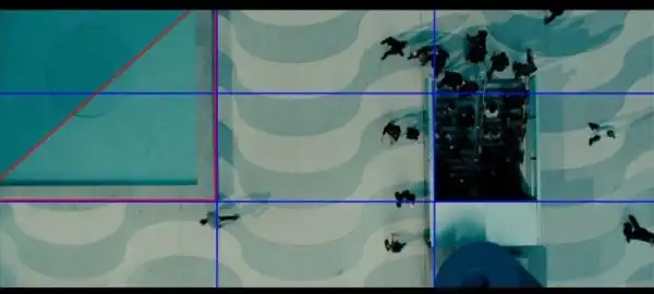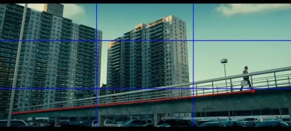 Два больших здания, занимающих две трети кадра слева и открытое небо в трети справа придают удивительное ощущение баланса. В результате всё внимание зрителя сосредоточено на крошечной фигуре Бена Стиллера. Этому способствует и диагональ, которую образует мост (помечено красной стрелкой)