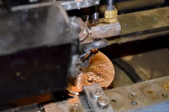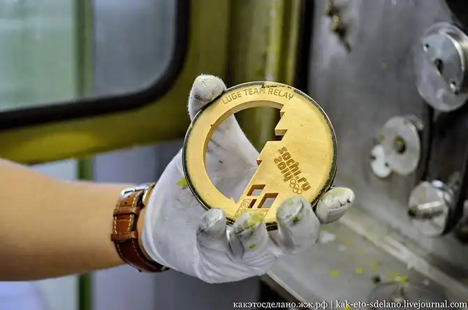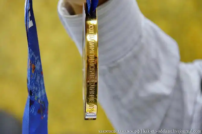 Это золотая медаль, но вы не видели ее в репортаже потому, что на самом деле она – серебряная!) То есть внутри она серебряная, а золотом покрывается в гальванической ванне (этого этапа нет в моем репортаже) и становится тяжелее серебряной медали всего на 6 грамм. При этом она толще всего на несколько микрон и невооруженным взглядом этого не увидеть.