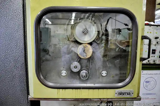 После того, как отверстия для кристаллов вырезаны (о них рассказ ниже), медаль попадает на прецизионный плоско-шлифовальный станок, на котором мастер шлифует аверс и реверс корпуса медали, для придания требуемой фактуры аверсу и реверсу медали.