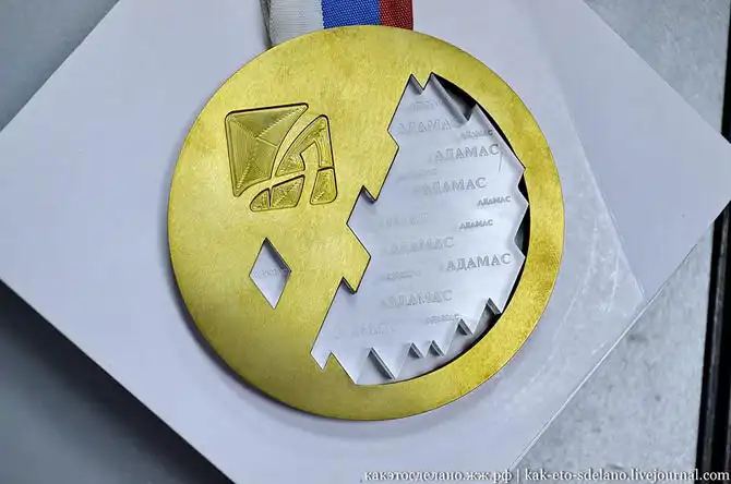 Изначально, для того, чтобы получить права на изготовление медалей был проведен конкурс среди разных компаний. «Адамас» сделал лучшую версию медали в соответствии с техническим заданием Оргкомитета и выиграл конкурс. Но создание прототипа медали было завуалировано под юбилей завода, чтобы никто не догадался об истинной цели изготовления медали. В ней легко угадываются черты нынешней награды, которая конечно отличается от прототипа.
