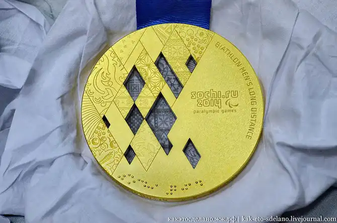 А эти штифты вручную устанавливаются на аверсе паралимпийской медали и складываются в символы SOCHI2014 на языке Брайля.
