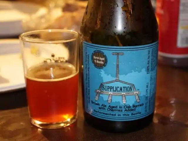 Пиво Supplication варят в пивоварне Russian River (Калифорния). Этот кислый эль 12 месяцев бродит в бочках из под вина Пино Нуар с вишней. В результате получается терпкий, сложный вкус.