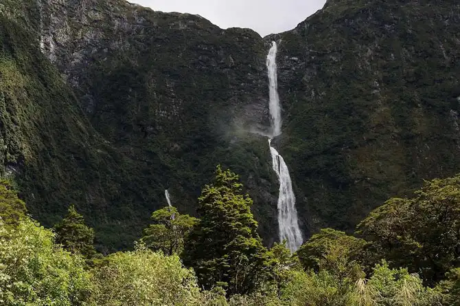 К югу от Милфорд Саунд находится Сазерленд, самый известный водопад Новой Зеландии. Это невероятно высокий водопад в 580 метров, с практически вертикальным углом падения. Поток воды здесь никогда не ослабевает, как бывает с некоторыми подобными местами в других уголках мира. Громоподобный Сазерленд своим шумом и грохотом вызывает восхищение у всех, кто оказался рядом. Это мощь, красота и грация, слившиеся воедино в общем потоке.