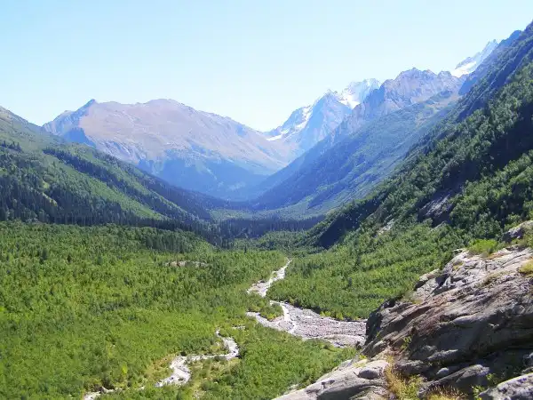 Грустная история у очаровательного водопада на реке Апсат, у Мраморного Межгорья. Именно здесь была последняя остановка узников, направляющихся в ГУЛАГ, многие из которых гибли, не вынося трудного перехода, а вокруг водопада оставались безымянные могилы. Возможно поэтому, столь живописное место не стало популярным среди туристов. К слову, если подойти к краю водопада и внимательно всмотреться в бушующую внизу воду, можно рассмотреть, что в глубине ущелья расположен ледник.