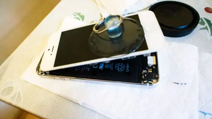 Для следующего шага понадобится присоска с креплением. Подойдет вообще любая, даже строительная. Суть в том, чтобы вытащить пластиковую часть из металлического корпуса. Для этого нужно присосать присоску максимально близко к кнопе HOME и медленно вытаскивать экран, держа корпус.
